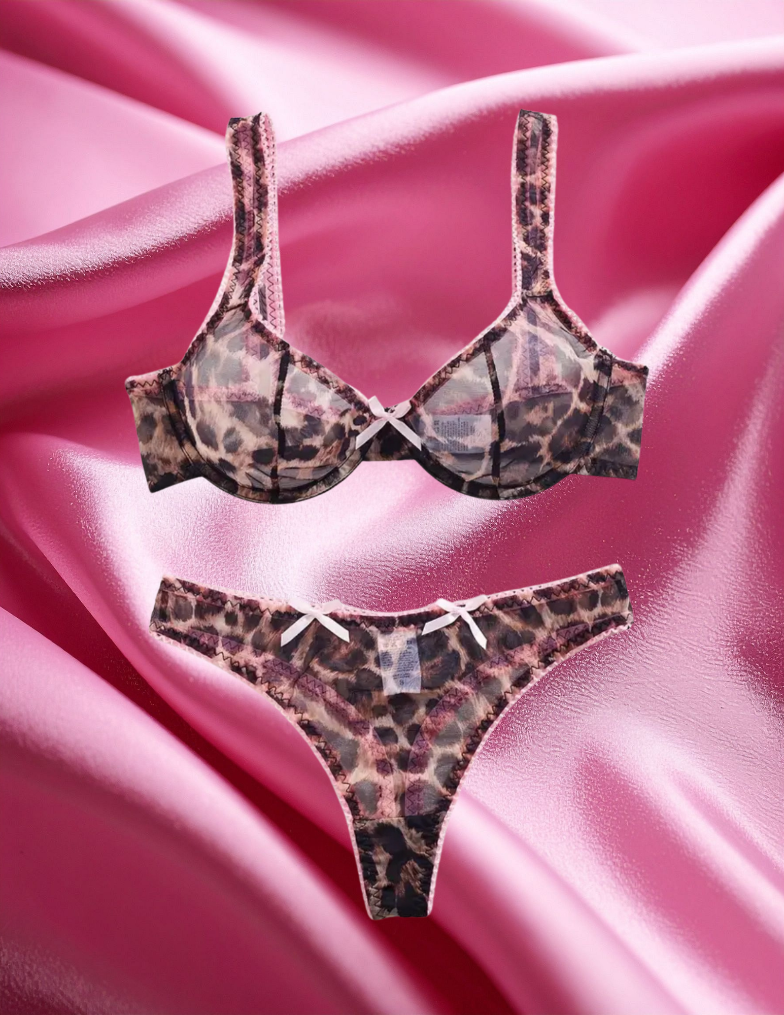 Unleash your inner feline with the Coquette Kitty 2pc set! This cheeky ensemble features sheer mesh with a purr-fectly wild cheetah print, framed by delicate pink trim. Adjustable straps and a thong cut bottom makes it Meow-velous!