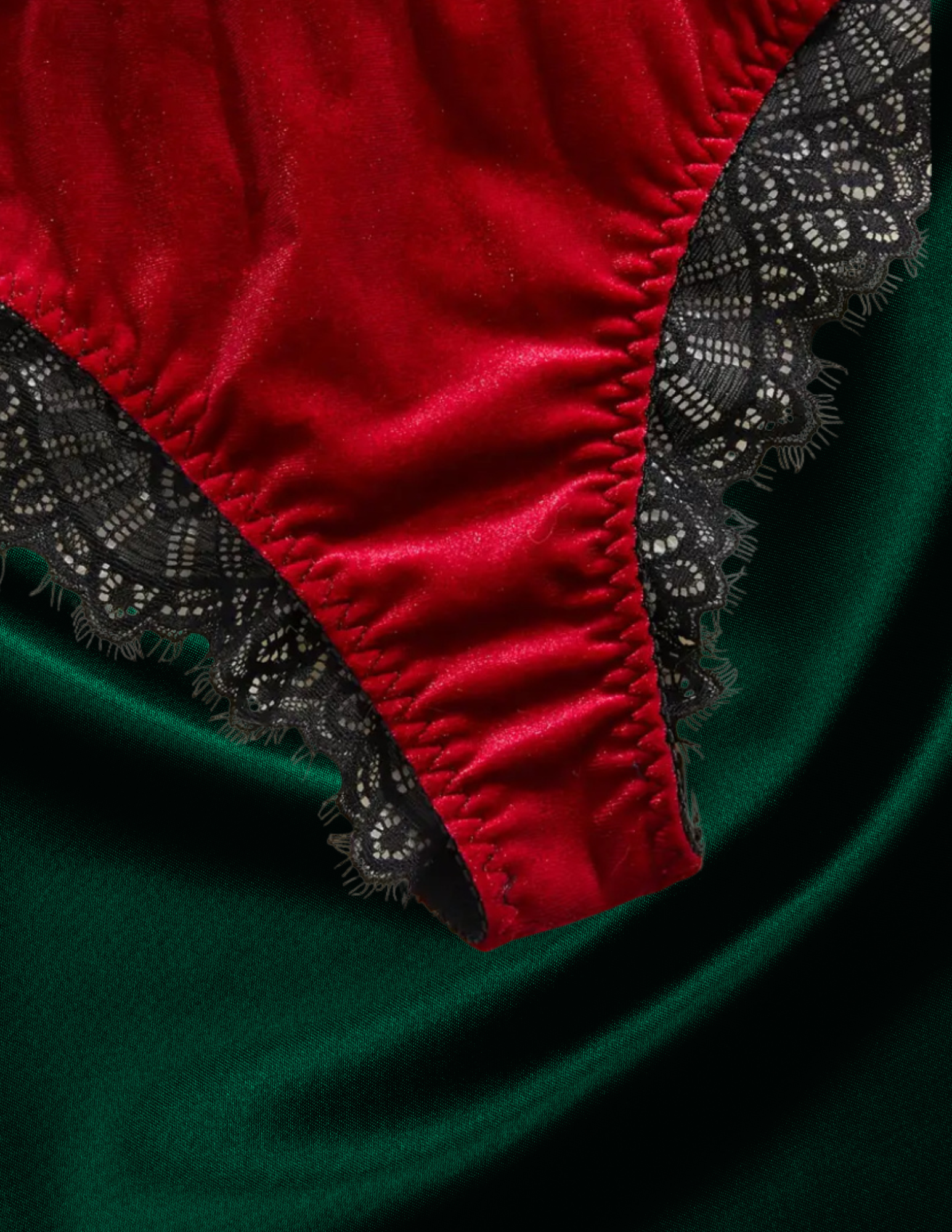 SHIPS DEC 5th Indulge in luxury with the Santa Baby 2pc bra and panty set. Beautiful red stretch stretch fabric creates an elegant look. Adjustable straps provide a perfect fit while the high on the hip cut flatters the thighs and legs. Elevate your lingerie collection with this sensual set.