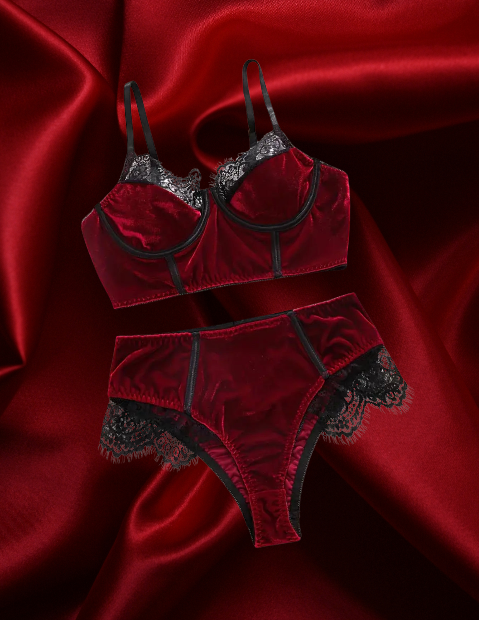 Indulge in luxury with the Velvet Dream 2pc bra and panty set. Deep red velvet stretch fabric paired with delicate black lace details create a sultry yet elegant look. Adjustable straps provide a perfect fit while the peekaboo hole on the booty area adds a touch of playfulness. Elevate your lingerie collection with this sensual set.
